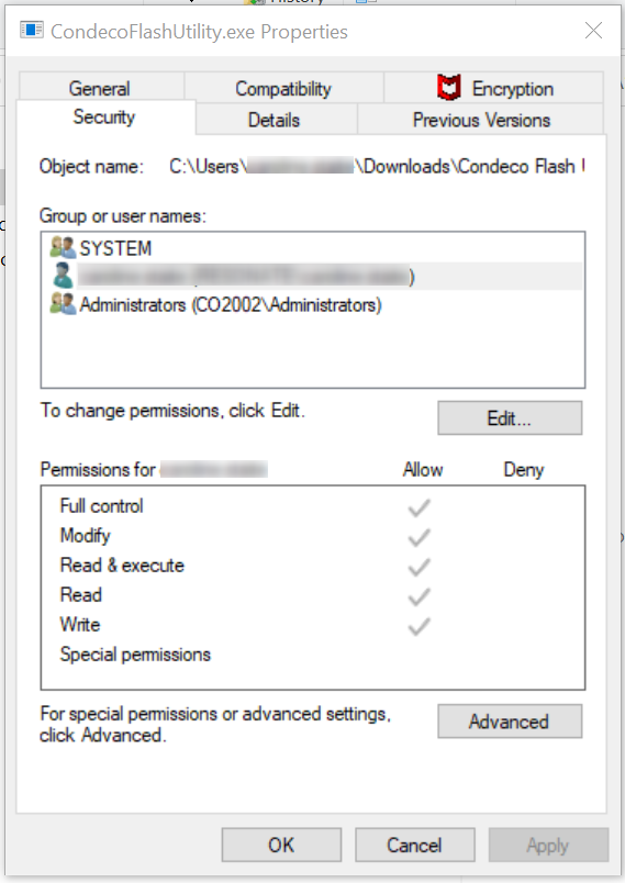 - If the program does not run, Windows users with admin accounts can right-click CondecoFlashUtility.exe and click Run As Administrator, otherwise right-click CondecoFlashUtility.exe > select Properties > click Security tab > select the user account and check Read & execute permissions are allowed.